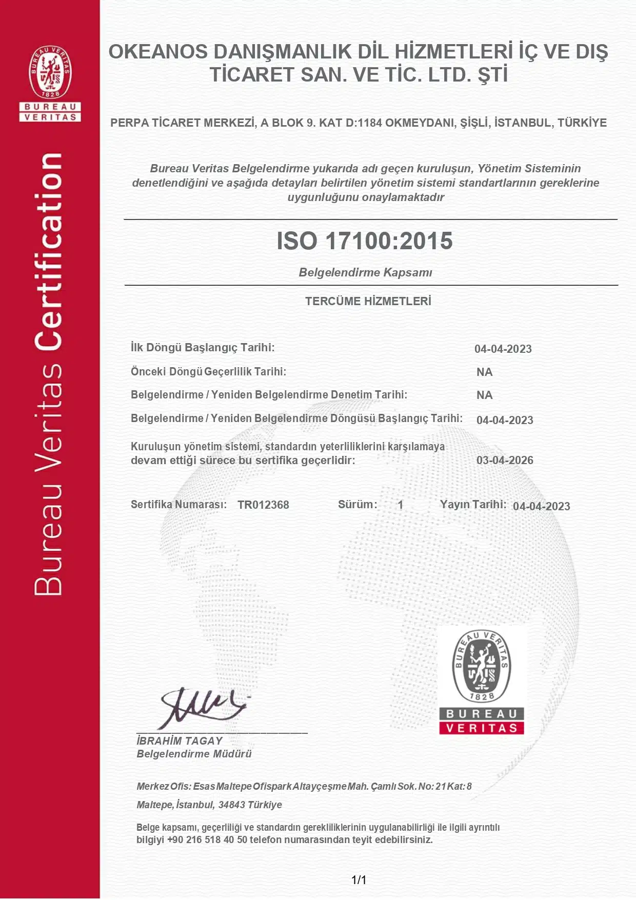2013 yılında aldığımız EN 15038 Tercüme Hizmetleri Kalite Standartları belgesi, 20023 yılında ISO 17100 Tercüme Hizmetleri Kalite Standartları olarak güncellenmiş, şirketimiz ve hizmetlerimiz 2023 yılı itibariyle ISO 17100 olarak Bureau Veritas firması tarafından belgelendirilmiştir.